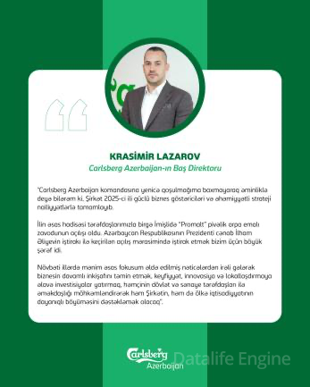 Növbəti illərdə mənim əsas fokusum əldə edilmiş nəticələrdən irəli gələrək biznesin davamlı inkişafını təmin etmək, keyfiyyət, innovasiya və lokallaşdırmaya əlavə investisiyalar yatırmaq, həmçinin dövlət və sənaye tərəfdaşları ilə əməkdaşlığı möhkəmləndirərək həm Şirkətin, həm də ölkə iqtisadiyyatının dayanıqlı böyüməsini dəstəkləmək olacaq,” – Krasimir Lazarov, Carlsberg Azerbaijan-ın Baş direktoru qeyd edib.